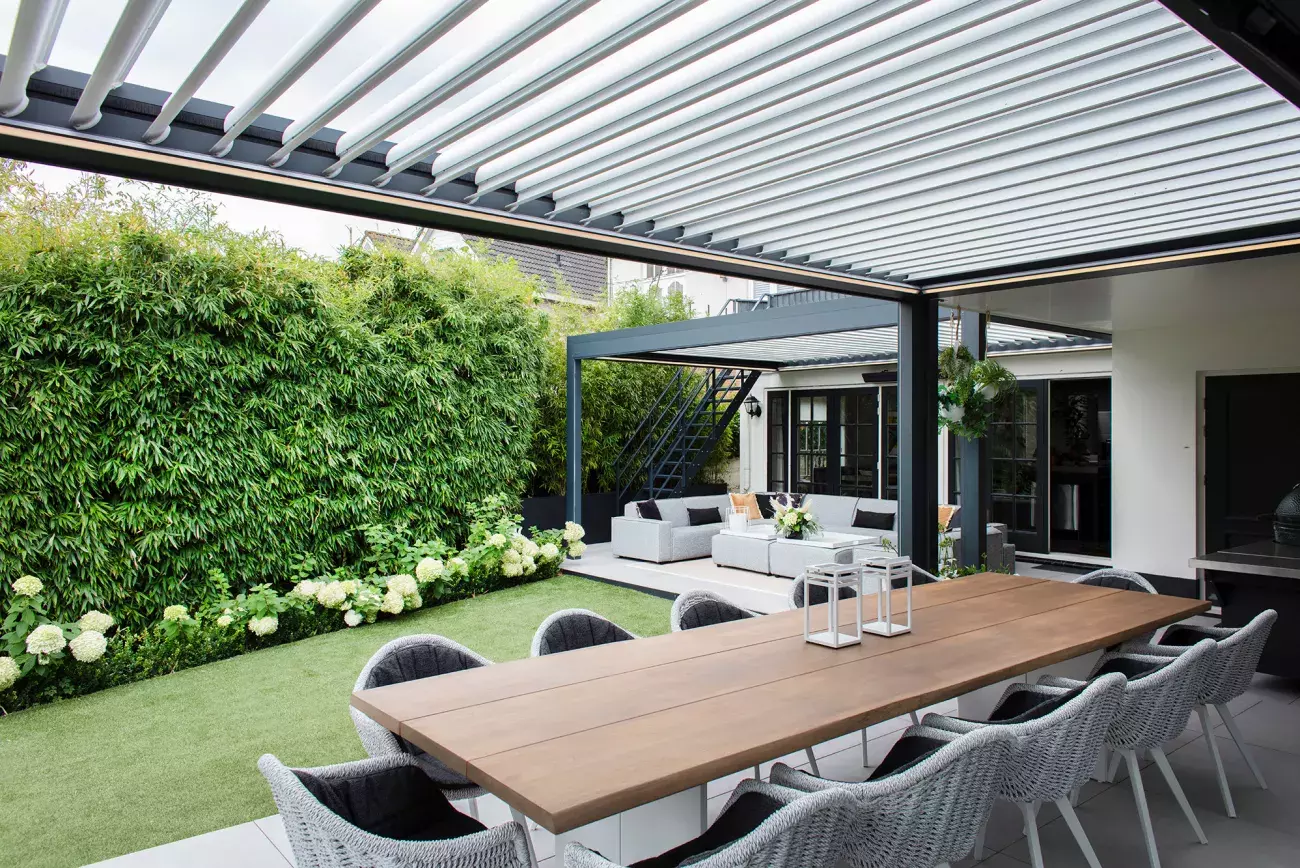 Vil du kunne regulere lys og ventilation på din terrasse? En pergola med lameller giver dig mulighed for at justere, hvor meget sollys du vil have, og skærme af for regn. De motorstyrede lameller kan vippes efter behov, så du altid har den perfekte balance mellem lys og skygge. Perfekt til dig, der vil have et stilfuldt og praktisk uderum året rundt.